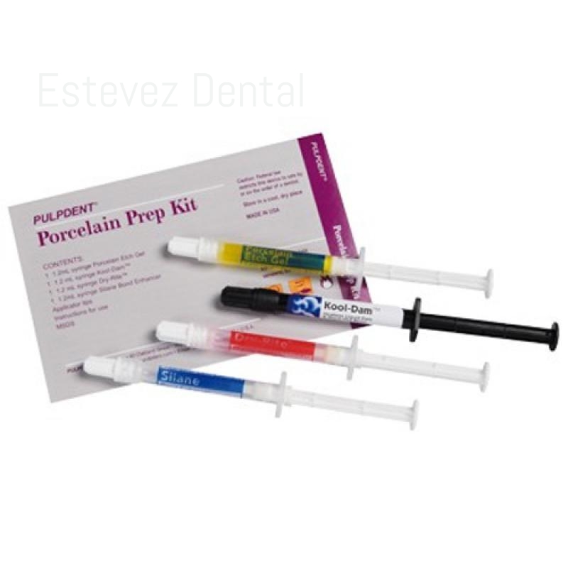 1 jeringa de 1,2 mL Gel de ácido fluorhidrico al 9,6% + 1 jeringa de 1,2 mL Silano + 1 jeringa de 1,2 mL Dry-Rite + 1 jeringa de 1,2 mL Kool- Dam + Puntas aplicadoras