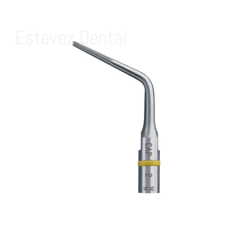 INSERTO ENDODONCIA CAP2CARACTERÍSTICAS:- Microinserto estriado de 9 mm y conicidad del 5%- El inserto CAP2 tiene una parte lateral y un extremo activos y se utiliza con el método de barrido para eliminar puentes de dentina- Localización del MB2 (2º canal mesiobucal) y búsqueda de conductos ocultos- Preparación de la cámara pulpar- Eliminación de la capa de dentina que puede ocultar el acceso al conducto MB2