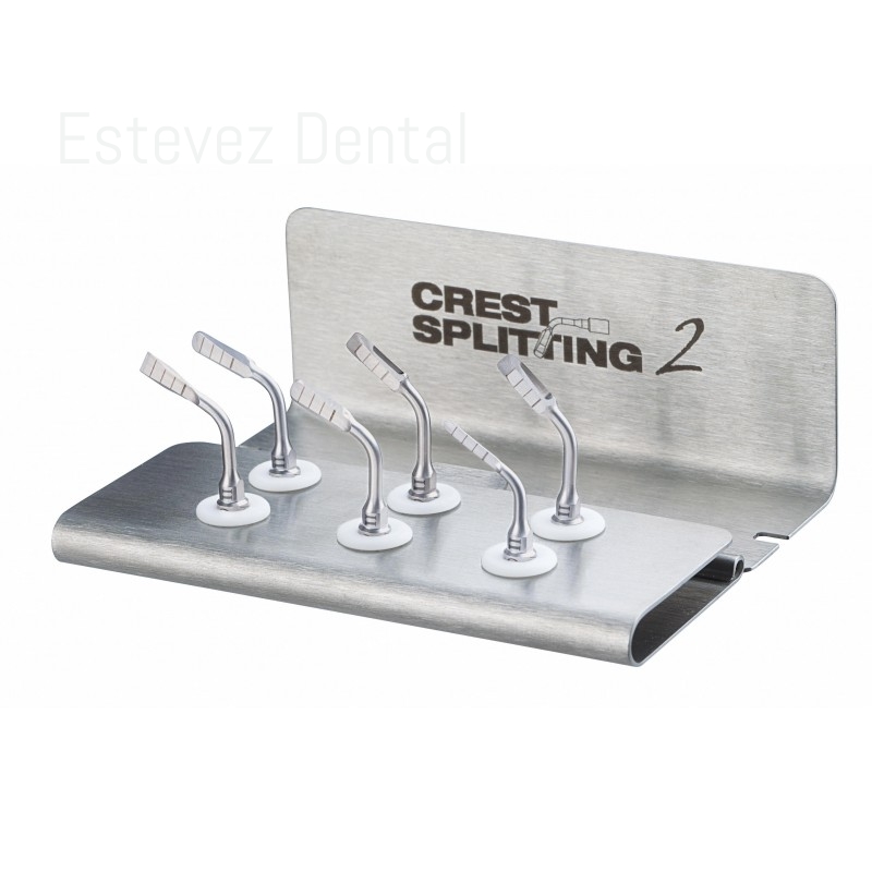 KIT CREST SPLITTING 2CARACTERÍSTICAS:- CS1: Inserto fino dedicado a la osteotomía piloto de hasta 8 mm de profundidad. Anchura: 0,55 mm.- CS2: Inserto dedicado a la segunda osteotomía de hasta 8 mm de profundidad. Anchura: 0,85 mm.- CS3: Escalpelo utilizado para las incisiones de descargas en las zonas mesial y distal, hasta 8 mm de profundidad. Anchura: 0,5 mm.- CS4: Inserto cónico para la expansión ósea. Anchura del inserto: de 1,80 mm a 8 mm de profundidad.- CS5: Inserto cónico para la expansión ósea. Anchura del inserto: de 2,75 mm a 8 mm de profundidad.- CS6: Inserto cónico para la expansión ósea. Anchura del inserto: de 3,75 mm a 8 mm de profundidad.CONTENIDO:- 6 Insertos (CS1, CS2, CS3, CS4, CS5, CS6)- 1 Caja Inoxidable