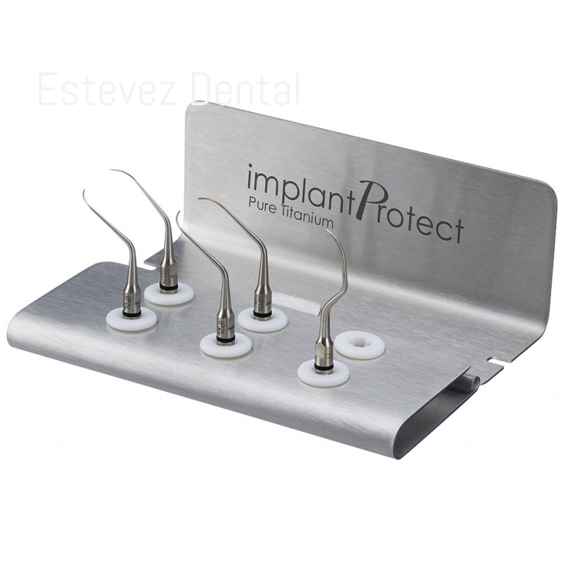 KIT IMPLANT PROTECT 5 PUNTAS Insertos (IP1-IP2L-IP2R-IP3L-IP3R) SATELECCARACTERÍSTICAS:- Insertos de titanio puro de grado 4 para evitar transferencias de materiales hasta el implante- IP1: Para zona superficial de pilares de implantes y apoyos anchos. Punta con el extremo activo más amplio, para desbridamientos y limpieza, puede usarse sin cirugía en implantes sin movilidad y bolsas inferiores a 5 mm Recomendado para implantes sin pérdida ósea (alrededor de 2 mm)- IP2L: Para la zona intermedia del implante, angulado izquierdo. Con angulación izquierda permite su uso sin cirugía así como en cirugía , para limpieza y desbridamiento del tercio medio del implante, gracias a su curvatura se adapta perfectamente aun sin visibilidad, fácil manejo gracias a la percepción táctil que aporta el titanio- IP2R: Para la zona intermedia del implante, angulado derecho. Con angulación derecha permite su uso sin cirugía así como en cirugía , para limpieza y desbridamiento del