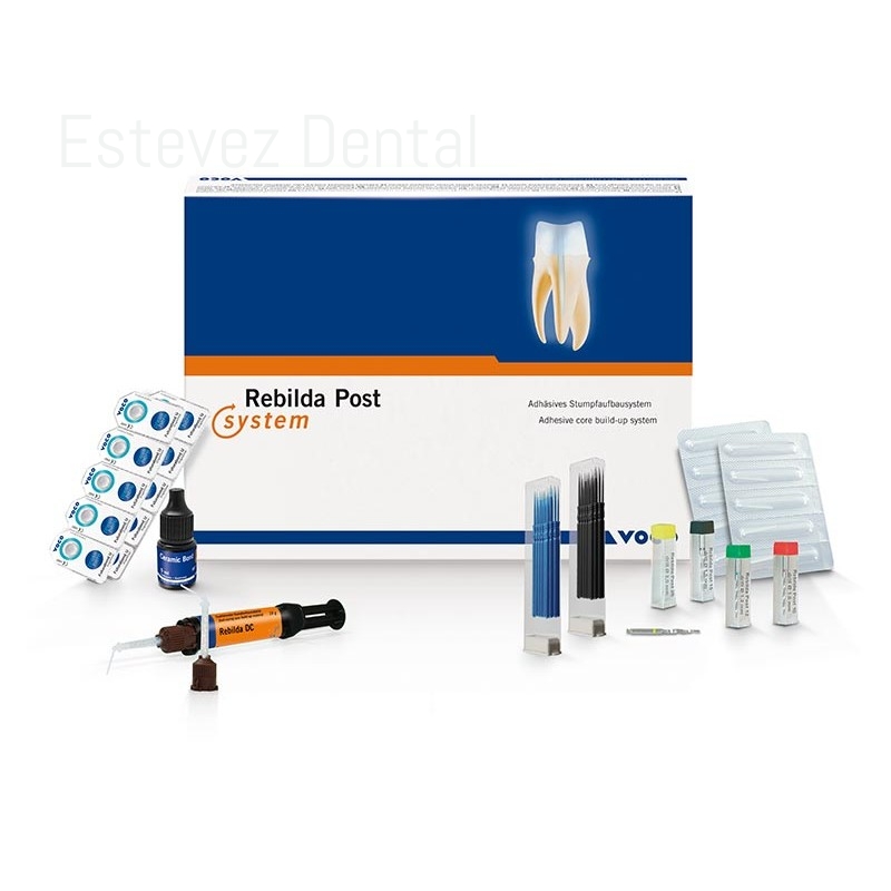 REBILDA POST SYSTEMCARACTERÍSTICAS: - Comportamiento elástico similar al diente, alta resistencia a la flexión- Alta radiopacidad (350 %Al)- Forma anatómica- Fijación adhesiva- Revisión posible- Todos los materiales en el set están adaptados uno al otro- Colocación del poste y reconstrucción de muñon en un sólo paso INDICACIONES: - En casos de sustancia dentaria insuficiente, soporte del muñón en la reconstrucción postendodóntica para el posterior apoyo y fijación de restauraciones coronariasCONTENIDO:- Set 5 poste de (ø 1,2 mm, ø 1,5 mm, ø 2,0 mm)- 1 fresa piloto de (ø 1,2 mm, ø 1,5 mm, ø 2,0 mm)- Ceramic Bond frasco 5 ml- Futurabond DC SingleDose 15 uds- Rebilda DC jeringa QuickMix 10 grs. dentina- Accesorios