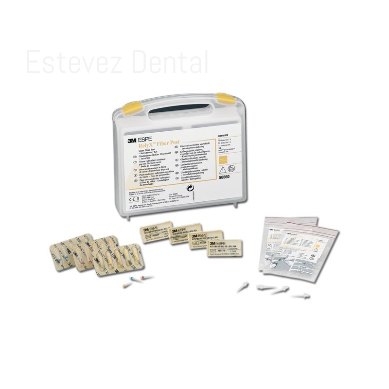 RELYX FIBER POST KITCARACTERÍSTICAS: - Mayor resistencia a la fatiga que la mayoría de los principales postes de fibra de vidrio- La punta de elongación RelyX Unicem Aplicap permite un cementado virtualmente exento de atrapamiento de aire- Estética gracias a su translucidez y sin el riesgo de corrosión que puede aparecer con postes metálicosCONTENIDO:- 1 caja con 5 uds. de: poste de tamaño 1 (1,3 mm diám.), poste de tamaño 2 (1,6 mm diám.) y poste de tamaño 3 (1,9 mm diám.)- 4 fresas: tamaño 1, tamaño 2, tamaño 3 y una fresa universal, 20 puntas de elongaciónAPLICACIONES RECOMENDADAS: - Insuficiente estructura dentaria residual (< 4mm)- Necesidad de utilizar un poste radicular para ofrecer sostén y fijación a la restauración coronal