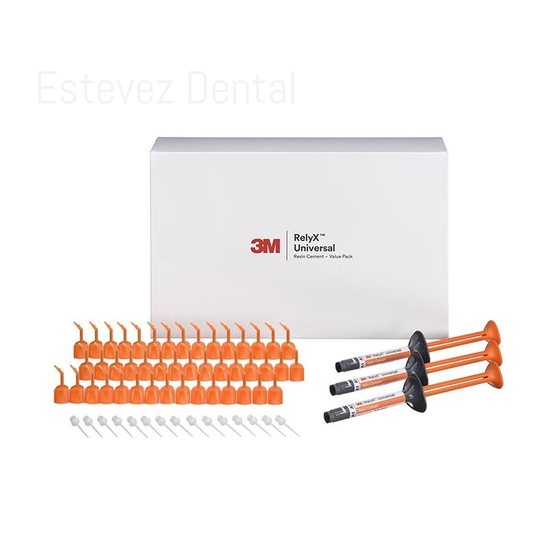 RELYX UNIVERSAL PACK AHORRO COLOR A1CARACTERÍSTICAS:- Cemento de resina Universal de curado dual para cementación adhesiva y autoadhesiva- Simplifica el proceso de trabajo y reduce el stock, fácil de utilizar, ahorra espacio, tiempo y dinero- Jeringa única de automezcla con autosellado que minimiza el desperdicio de material- Fuerza de adhesión excepcional en modo auto y fotopolimerizable- Mayor fuerza de adhesión a todos los sustratos con el adhesivo 3M Scotchbond Universal Plus- Prácticamente sin sensibilidad postoperatoria- Gran estética con colores de alta estabilidad y fluorescentes- Retirada fácil y rápida del excesoINDICACIONES:- Para todo tipo de indicaciones de cementos adhesivos y autoadhesivos- Carillas- Carillas oclusales (tabletops)- Inlays/onlays- Coronas- Puentes- Postes endodónticos- Puentes Maryland- Puentes Inlay/Onlay- Para todo tipo de materiales incluido cerámicas vítreas, zirconia, metal y resinaCONTENIDO:- 15 Micro Puntas de mezcla 3M R