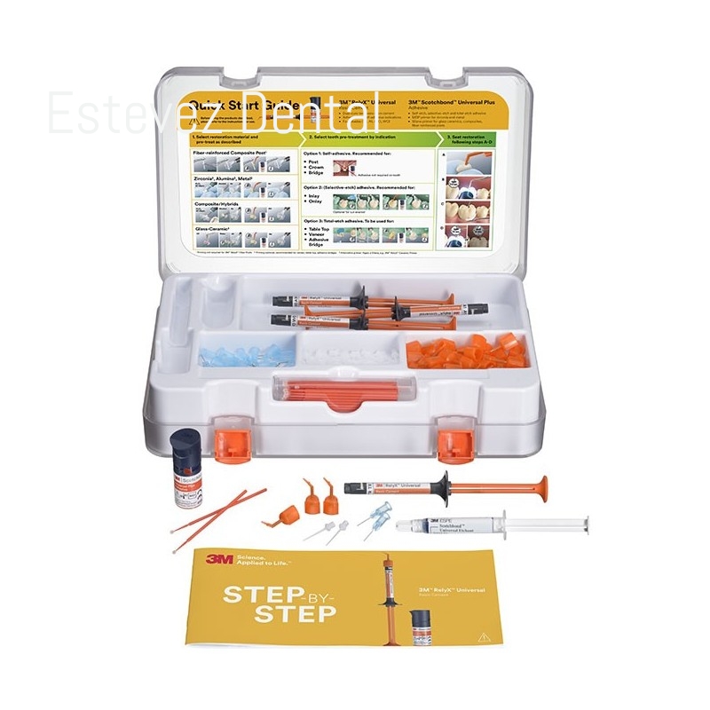 RELYX UNIVERSAL KIT INTROCARACTERÍSTICAS:- Cemento de resina Universal de curado dual para cementación adhesiva y autoadhesiva- Simplifica el proceso de trabajo y reduce el stock, fácil de utilizar, ahorra espacio, tiempo y dinero- Jeringa única de automezcla con autosellado que minimiza el desperdicio de material- Fuerza de adhesión excepcional en modo auto y fotopolimerizable- Mayor fuerza de adhesión a todos los sustratos con el adhesivo 3M Scotchbond Universal Plus- Prácticamente sin sensibilidad postoperatoria- Gran estética con colores de alta estabilidad y fluorescentes- Retirada fácil y rápida del excesoINDICACIONES:- Para todo tipo de indicaciones de cementos adhesivos y autoadhesivos- Carillas- Carillas oclusales (tabletops)- Inlays/onlays- Coronas- Puentes- Postes endodónticos- Puentes Maryland- Puentes Inlay/Onlay- Para todo tipo de materiales incluido cerámicas vítreas, zirconia, metal y resinaCONTENIDO:- 4 Jeringas de 3,4 g de los colores TR, A1, A3O y WO- 60 Micro Puntas de mezcla 3M RelyX Universal- 20 Puntas de Elongación- 1 Bote de 5 ml de Adhesivo 3M Scotchbond Universal Plus- 1 Jeringa de 3 ml de ácido grabador 3M Scotchbond Universal- 25 Puntas azules para ácido; 50 - Micropinceles naranjas- Guía Técnica- Instrucciones de Uso