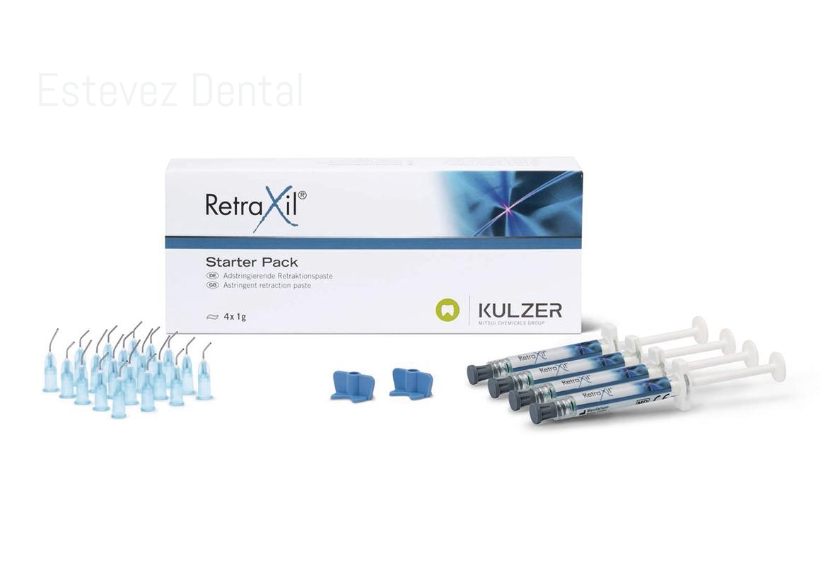 RetraXil® es una pasta de retracción astringente para el desplazamiento temporal del margen gingival y el secado del surco gingival. RetraXil® asegura un surco gingival limpio y garantiza unos márgenes de preparación bien expuestos y sin fluidos:Aplicación atraumática gracias a su cánula ultra fina de 0.9mm.Hemostasia fiable.Campo visual muy cómodo gracias al elevado contraste del color azul.Jeringa estable multidosis, por ejemplo, 10-15 molares o 20-25 premolares.El innovador dispositivo de ayuda al enrosque de la cánula facilita la aplicación.Compatible con técnicas de impresión convencionales y digitales.Contenido:4 x 1g jeringas RetraXil,20 Cánulas,2 Dispositivos de ayuda al enrosque.