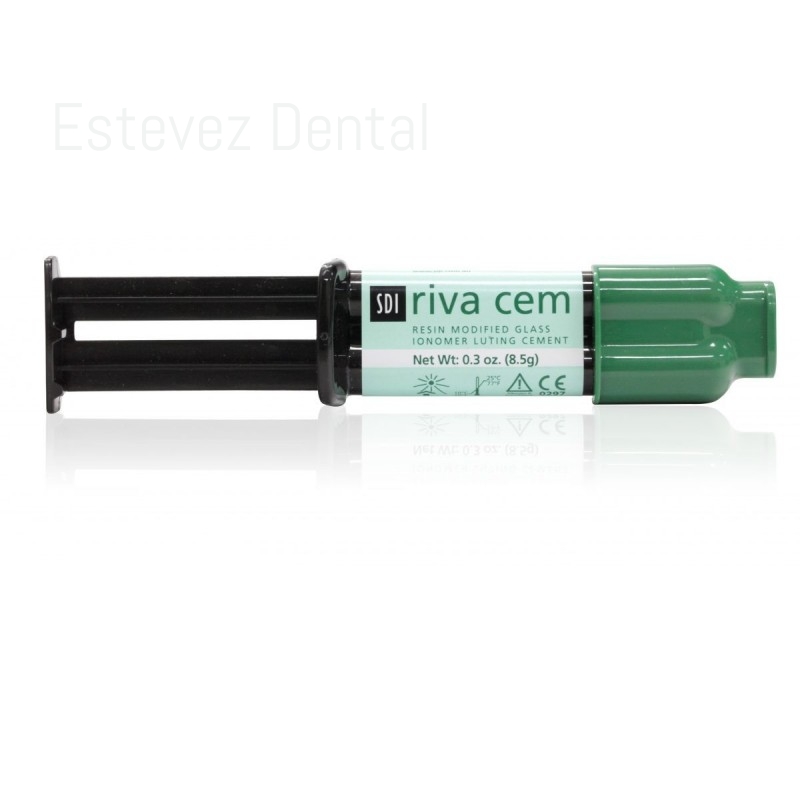 RIVA CEM SDI JER 8,5 gCARACTERÍSTICAS: - Es un material obturador a base de ionómero de vidrio de pasta/pasta con resina modificada, liberación de flúor, radiopaco y autocurado. Está indicado para la cementación permanente de restauraciones cerámicas de base metálica y núcleo fortalecido y aplicaciones Ortodónticas- Incluye la opción adicional de curado mediante luz, para de esta forma permitir la retirada temprana de los excesos de cemento, una perfecta adhesión dental, liberación de flúor y una fluidez ideal para la cementación. Riva cem está disponible en un tono universal (amarillo claro) y con presentación en doble jeringa cuyos componentes pueden mezclarse fácilmente de forma manualCONTENIDO: - Envase 1 jeringa