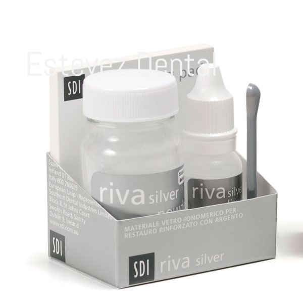 Material restaurador reforzado con aleación de plata sin mercurio y liberador de flúor.Kits de Polvo/Líquido Riva Silver.Botella de líquido Riva Silver de10g (8.9mL).Pote de Polvo Riva Silver de 32g.Accesorios.