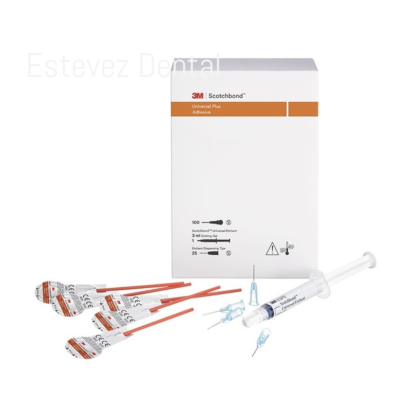 SCOTCHBOND UNIVERSAL PLUS KIT INTRO BOTECARACTERÍSTICAS:- Primer adhesivo universal radiopaco que reduce el riesgo de sobre tratamiento y diagnóstico erróneo por radiografías dudosas- Adhesivo universal apto para todo tipo de adhesión en restauraciones directas e indirectas y todas las técnicas de grabado- Prácticamente sin sensibilidad postoperatoria- Excelente adhesión a diente y todo tipo de sustratos de restauración sin necesidad de uso de primers por separado, silano o activadores- Libre de derivados de BPA como la resina BisGMA- Adhiere y sella dentina afectada por caries, facilitando los protocolos de una Odontología Mínimamente Invasiva y preservando al máximo el diente natural- Tecnología 3M alineada con el cemento de resina 3M RelyX Universal- Disponible en bote de diseño optimizado y tapa abatible (hasta 200 aplicaciones) o en unidosis para un control eficiente de la higieneINDICACIONES:- Adhesivo para composites, material de reconstrucción de muñ