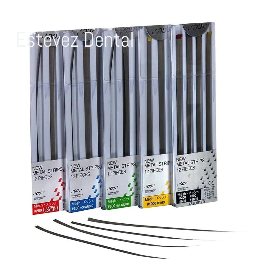 Tiras de metal codificadas, electrochapadas con partículas de óxido de aluminio para acabado de contorno proximal y pulido de toda clase de materiales restauradores.