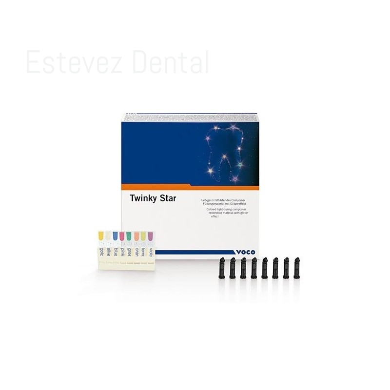 TWINKY STAR KIT Cápsulas 40 x 0,25 gMaterial de restauración de color y fotopolimerizable a base de compómero con efecto brillante.CARACTERÍSTICAS:- Ocho colores atractivos con efecto brillante (Oro, Plata, Azul, Rosa, Verde, Naranja, Limón y Mora)- Simple y rápida aplicación desde las cápsulas- Pulido sobresaliente- Basado en la probada tecnología de compómeros de VOCO- Colorímetro elaborado con el material original- Los padres pueden motivar más fácilmente al niño para visitar al dentista- Los niños superan su ansiedad- Herramientas de marketing (disponibles) para el grupo objetivoINDICACIONES:- Obturaciones de dientes deciduosCONTENIDO:- Set Caps 40 × 0,25 grs. (5 de cada color - Oro, Plata, Azul, Rosa, Verde, Naranja, Limón y Mora)- Colorímetro