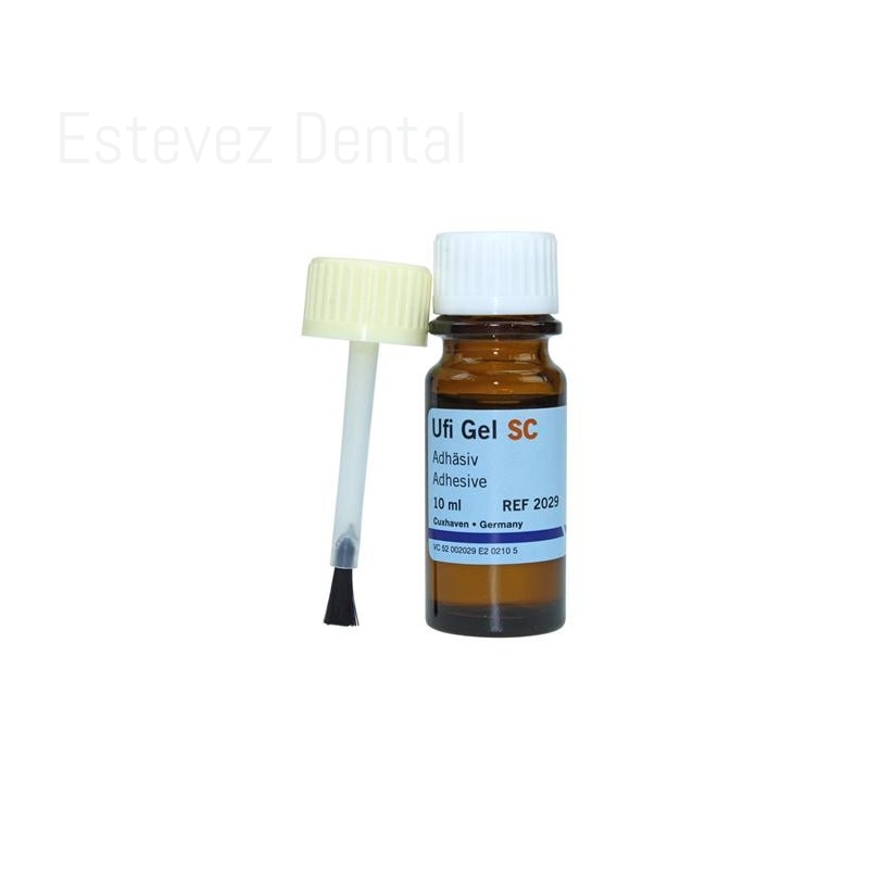 UFI GEL SC ADHESIVO 10mlMaterial de rebase permanentemente blando y de curado frío a base de silicona.CARACTERÍSTICAS:- Silicona de rebase de excelente calidad- Rebase completo en una sola sesión en el consultorio- Se mantiene permanentemente blando- Adhesivo especial para extremar la adhesión de la silicona a la prótesis- Biocompatible (sin metacrilatos)- Sabor y olor neutros- Estable en color y estético, con efecto de adaptación de color- En laboratorio: menos pasos que con otros materiales de curado frío- Para todas las prótesis a base de PMMA- Fácil y rápida aplicación en caso de rebases directos e indirectos- Excelente adaptación sobre detalles delicados para un asentamiento preciso de la prótesis- Resistente contra limpiadores de prótesis convencionalesINDICACIONES:- Rebases permanentes y blandos de prótesis totales y parciales- para la eliminación de lugares de presión- para el sellado de la línea A- en caso de cresta blanda y dificultades de adhesión-