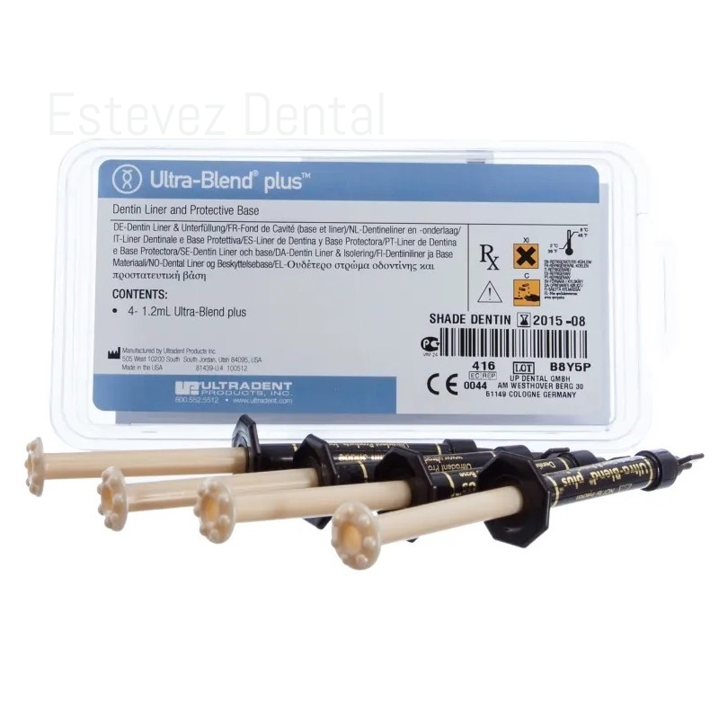 ULTRA BLEND PLUS DENTINA 1,2 mlEl forro cavitario Ultra-Blend plus es un material radiopaco fotoactivado con hidróxido de calcio sobre una base de dimetacrilato de uretano (UDMA). Es perfecto para taponar la pulpa y no se disuelve con el tiempo. El forro cavitario Ultra-Blend plus tiene una alta carga para una reducción mínima.CARACTERÍSTICAS: - Forro cavitario bioactivo1 y material de recubrimiento pulpar- Liberación superior de calcio2- Fotopolimerizable- Aplicación controlada y precisa con jeringa- Sin necesidad de mezcla- No se disuelve con el tiempo- Radiopaca- Alto relleno- Úselo para cubrir MTAFlow para el recubrimiento pulpar antes de la restauraciónCONTENIDO: - 4 Jeringas de 1,2 ml (1,64 g) Ultra-Blend plus Dentin