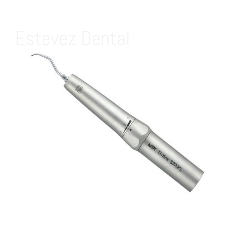 El scaler S970KL Ti-Max de NSK, es un ultrasonido neumático fabricado con cuerpo de titanio macizo pero ligero, con un recubrimiento Duracoat, a prueba de arañazos. Este material logra una superficie más agradable al tacto y fácil de manejar.