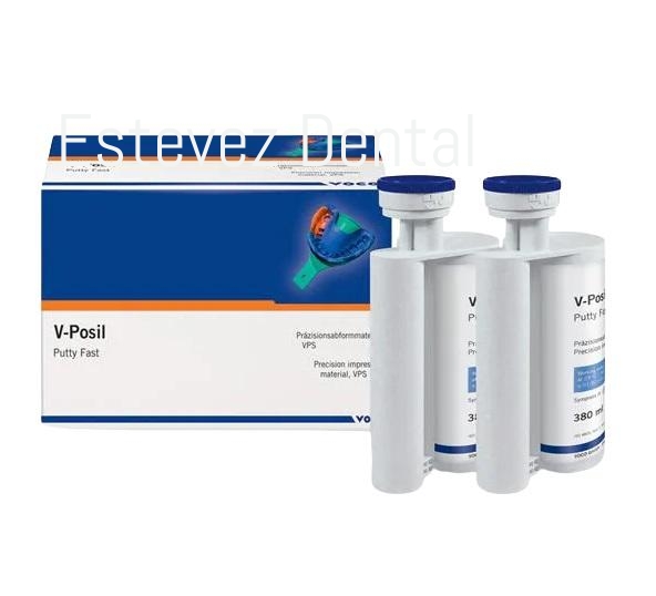 V-POSIL PUTTY FAST 2x380 mlCARACTERÍSTICAS: - Silicona A muy hidrófila para la más alta precisión- Alta exactitud a la dimensión- Largo tiempo de elaboración y a la vez un corto tiempo en la boca- La alta resistencia a la rotura y la alta recuperación elástica garantizan una seguridad durante y después de la tomaINDICACIONES: V-Posil Mono Fast se utiliza como material de impresión de viscosidad intermedia para cubetas o como material de impresión inyectable para:- sobreimpresiones para prótesis e implantes combinados (transmisión de postes de impresión y piezas primarias)- Buena hidrofilia, incluso en el estado fraguado, hace perfectamente el vaciado y así el tratamiento protésicoCONTENIDO:- Cartucho 2 x 380 ml