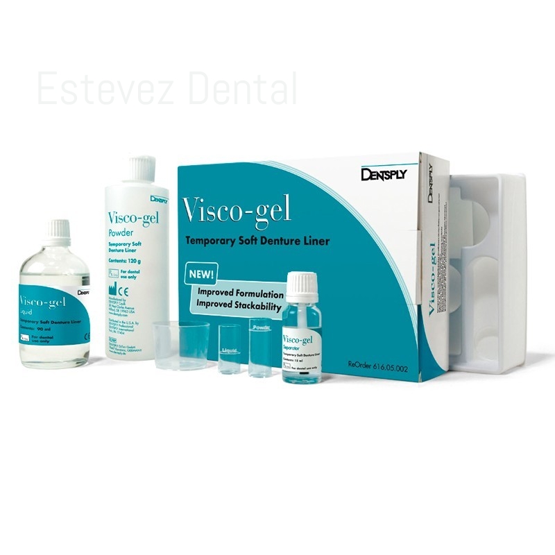 VISCOGEL STANDARD PACK BOTELLACARACTERÍSTICAS:- Viscogel es un acondicionador de dentaduras a base de metacrilato resilienteINDICACIONES:- Diseñado usarse como material acondicionador temporal para dentaduras completas y parcialesCONTENIDO:- 1 frasco de 120 g de polvo Visco-gel- 1 fraso de 90 ml de líquido Visco-gel- 1 bol para polvo- 1 medidor de líquido