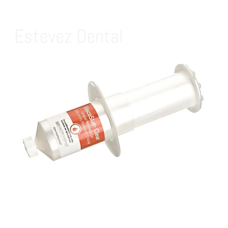 VISCOSTAT CLEAR CLORURO ALUMINIO 30 mlEl gel hemostático ViscoStat Clear se recomienda para restauraciones anteriores porque elimina rápidamente el sangrado menor sin dejar ningún residuo. La fórmula patentada de sílice tipo tejido detiene rápidamente el sangrado menor sin formar coágulos ni dejar residuos hemostáticos adheridos a la preparación, lo que da como resultado dientes sin manchas y tejidos blandos, una característica especialmente crítica en la "zona estética". Además, a diferencia de las soluciones hemostáticas a base de sulfato férrico, ViscoStat Clear hemostático no interfiere con la unión.CARACTERÍSTICAS:- Detiene todo sangrado intraoral menor, pero está diseñado específicamente para la zona estética.- El gel transparente no deja residuos y se enjuaga con facilidad- La entrega directa conveniente elimina el desperdicio- El gel antigoteo es viscoso pero se puede untar- No interfiere con la adhesiónCONTENIDO:- 1 Jeringa de 30 ml (38,52 g) IndiSpense