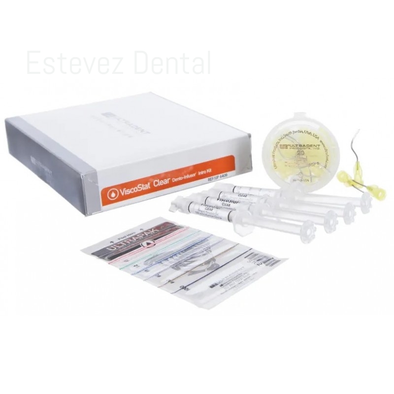 VISCOSTAT CLEAR KIT DENTO-INFUSOREl gel hemostático ViscoStat Clear se recomienda para restauraciones anteriores porque elimina rápidamente el sangrado menor sin dejar ningún residuo. La fórmula patentada de sílice tipo tejido detiene rápidamente el sangrado menor sin formar coágulos ni dejar residuos hemostáticos adheridos a la preparación, lo que da como resultado dientes sin manchas y tejidos blandos, una característica especialmente crítica en la "zona estética". Además, a diferencia de las soluciones hemostáticas a base de sulfato férrico, ViscoStat Clear hemostático no interfiere con la unión.CARACTERÍSTICAS:- Detiene todo sangrado intraoral menor, pero está diseñado específicamente para la zona estética.- El gel transparente no deja residuos y se enjuaga con facilidad- La entrega directa conveniente elimina el desperdicio- El gel antigoteo es viscoso pero se puede untar- No interfiere con la uniónCONTENIDO:- 4 Jeringas de 1,2 ml (1,42 g)- 20 Puntas metálicas Dento-Infusor