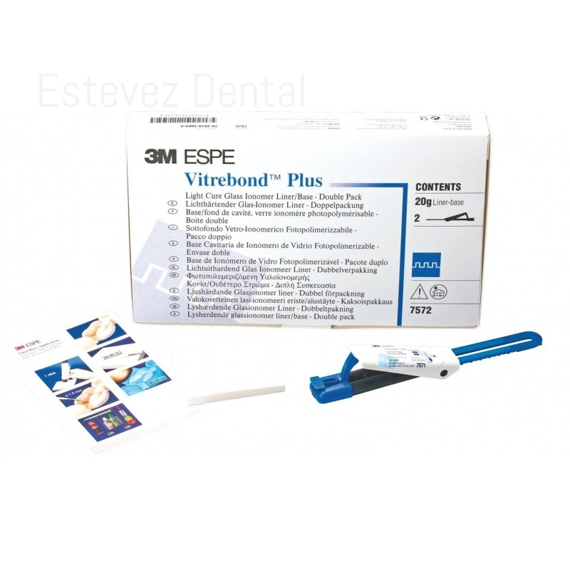 VITREBOND PLUS CLICKER 2 x 10 gLa adecuada fórmula de pasta/líquido de nuestro exclusivo dispensador Clicker ofrece la protección de una base cavitaria de ionómero de vidrio convencional sin la incomodidad de tener que medir.CARACTERÍSTICAS:- Dispensación precisa sin complicaciones y sin necesidad de utilizar más instrumentos- Basta con hacer clic, mezclar y usar. Mínima microfiltración (comparado con la base caitaria Vitrebond original) reduce la sensibilidad posoperatoria- Reduce los efectos de la contracción de polimerizaciónCONTENIDO:- 2 Clicker de 10 g.- Base Cavitaria Ionómero Vidrio Fotopolimerizable- Bloque