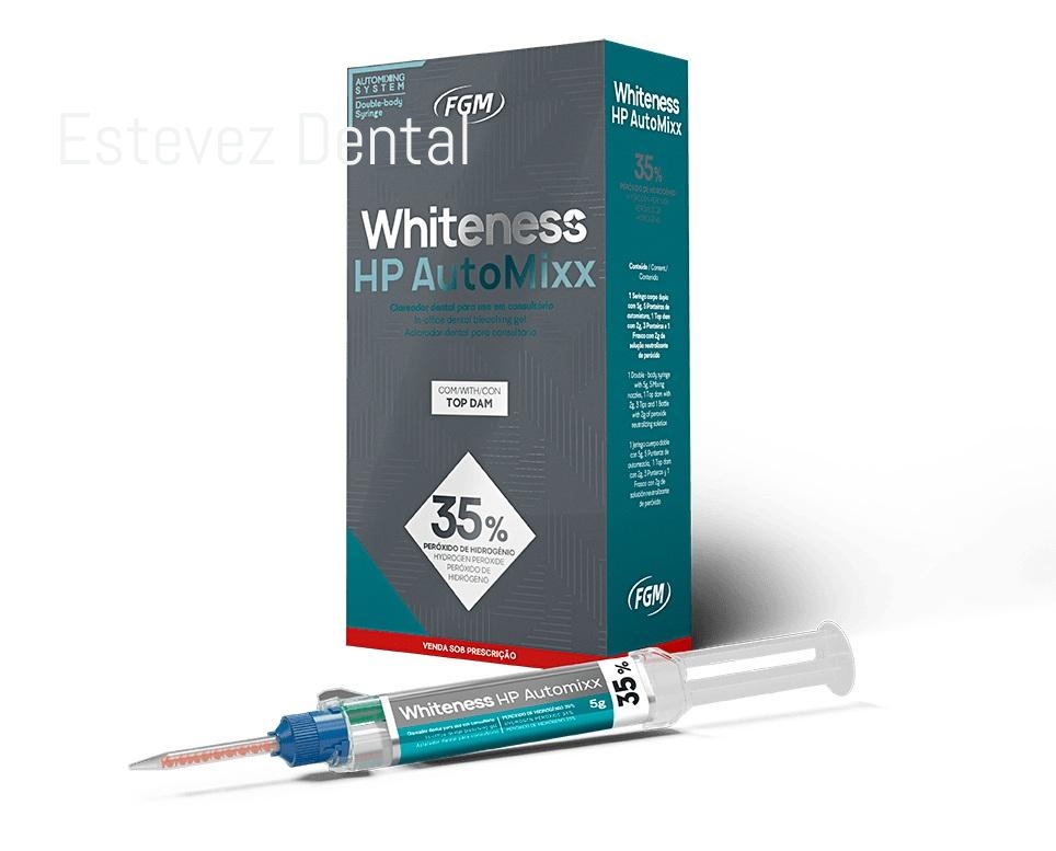 Blanqueador a base de Peróxido de Hidrógeno al 35% para aclaramiento de dientes vitales. Sistema de automezcla. Aplicación única por sesión. Contiene calcio: mantiene la integridad del esmalte dental.