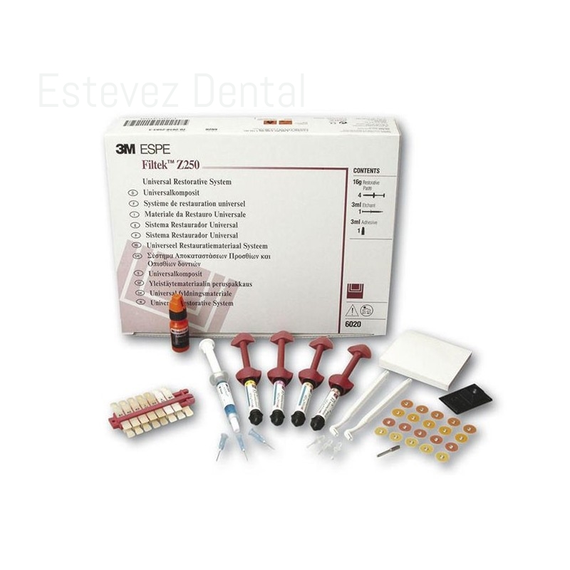 FILTEK Z250 KIT 6020 4 Jeringas (A2, A3,5, A4 y B3) + AdhesivoEl restaurador universal Filtek Z250, con la fiable tecnología híbrida de 3M ESPE, ha sido puesto a prueba más de un millón de veces. Es una opción ideal para fabricar de forma cómoda restauraciones de un único tono en la región anterior y, especialmente, posterior.CARACTERÍSTICAS:- Filtek Z250 ha sido valorado como una opción excelente para restauraciones estéticas duraderas en los dientes anteriores y posteriores.- Experiencia clínica a largo plazo- Fácilmente modelable y no pegajoso- Relleno patentado de circonio/sílice para una radiopacidad de gran contraste sin metales pesados añadidosUSOS:- Restauraciones directas anteriores y posteriores- Restauraciones indirectas: inlays, onlays y carillas- Técnica de sándwich- Reconstrucción de muñones- Reconstrucción de cúspides- FerulizaciónCONTENIDO:- 4 Jeringas de 4 g. colores: A2, A3, A4, B3- 1 Jeringa de 3ml de Ácido fosfórico- 1 Botellit