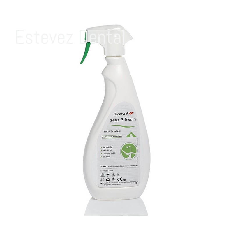 ZETA 3 FOAM 750 mlZeta 3 Foam es una espuma desinfectante y limpiadora sin alcohol lista para usar, especialmente recomendada para superficies de dispositivos médicos delicadosCARACTERÍSTICAS:- Amplio espectro de acción conforme a las últimas normas europeas sobre desinfección- Productos libres de aldehídos y fenoles- Compatibilidad probada hasta con las superficies más delicadasVENTAJAS:- Eficacia: alta protección para operadores y pacientes- Seguridad: sin aldehídos ni fenoles - Velocidad y conveniencia: desinfección y limpieza en un solo pasoFICHA TÉCNICA:- Tipo de producto: Desinfectante- Ingredientes activos: Sales de amonio cuaternario- Tiempo de acción: 1 a 5 minutos- Aplicaciones: Superficies delicadas- Características distintivas: Libre de alcohol, se puede utilizar en todas las superficiesESPECTRO DE ACCIÓN:Bactericida: EN 13727, EN 14561 (S. aureus, P. aeruginosa, E. hirae)Levaduricida: EN 13624, EN 14562 (C. albicans)Tuberculicida: EN 14348, EN 145