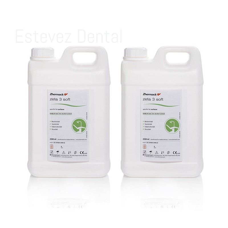 ZETA 3 SOFT 2 x 2,5 LitrosZeta 3 Soft es un desinfectante y detergente con alcohol, listo para usar, para superficies de dispositivos médicos.CARACTERÍSTICAS:- Amplio espectro de acción conforme a las últimas normas europeas sobre desinfección- Productos libres de aldehídos y fenoles- Compatibilidad probada hasta con las superficies más delicadasVENTAJAS:- Eficacia: alta protección para operadores y pacientes- Seguridad: sin aldehídos ni fenoles - Velocidad y conveniencia: desinfección y limpieza en un solo pasoFICHA TÉCNICA:- Tipo de producto: Desinfectante- Ingredientes activos: Alcoholes- Tiempo de acción: 1 a 5 minutos- Aplicaciones: Superficies normales- Características distintivas: Rápido, no deja residuosESPECTRO DE ACCIÓN:Bactericida: EN 13727, EN 14561 (S. aureus, P. aeruginosa, E. hirae)Levaduricida: EN 13624, EN 14562 (C. albicans)Tuberculicida: EN 14348, EN 14563 (M. terrae)Virucida: EN 14476 (poliovirus, adenovirus, norovirus y parvovirus, lo que
