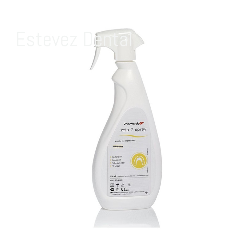 ZETA 7 SPRAY 750 mlZeta 7 Spray es un desinfectante listo para usar, para una desinfección rápida y sencilla de las impresiones.CARACTERÍSTICAS:- Amplio espectro de acción conforme a las últimas normas europeas sobre desinfección- Compatibilidad con todos los materiales para la toma de impresiones (siliconas de adición y condensación, alginatos, poliéteres, polisulfuros y polímeros de cloruro de polivinilo)VENTAJAS:- Eficacia: alta protección para operadores y pacientes- Altas desempeño: respeta la estabilidad dimensional de las impresiones y es compatible con los yesos, mejorando la precisión en la reproducción de los modelos de yesoFICHA TÉCNICA:- Tipo de producto: Desinfectante- Ingredientes activos: Alcoholes- Dilución: Listo para usar- Tiempo de acción: 3 minutos- Características distintivas: Mejora la suavidad del yeso en superficies de impresiones y reduce la formación de Mejora la suavidad del yeso en superficies de impresiones y reduce la form